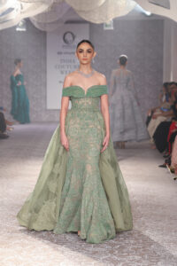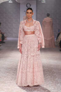 With the influx of Instagram, its far and wide reach, brings with it the definitive celeb angle, even though she believes a showstopper is overhyped. She chose someone who is from South Mumbai, not so much in the news, has quiet elegance so it worked well. “Anything an actress wears works, like the ivory and ice blue gown on Jacqueline Fernandes still does well, or the minty hued pre-draped, organza-lace sari with an embroidered bralet, as well as the introduction of red-hot pink this year,” she affirms.