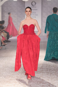 Isha decided to give us doses of time travel, with 20s flapper dresses with swinging beads, flaming reds, draped skirts moved around lithe thighs of Archana Akhil Kumar (she’s a timeless beauty), and corsets sat around toned bodies. In this subtle mix was Bollywood beauty Tara Sutaria preening, looking delicious in a gold corset. “I love lace and white, corsets are very flattering, they make me feel feminine and elegant,” said the actress. This one took five months to make, and declared that a modern bride is very cool, ready to break norms.