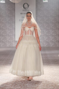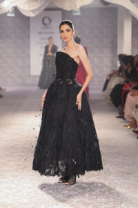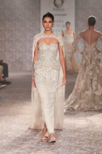 For ICW 2025, she confirms things happen, as they are willed, a divine timing unfolds, thus you can see the softness yet strength in the line, as some pieces have no embroidery. With her travels to Paris, Hong Kong, Dubai, she only fell deeper in love with timeless pieces that can be worn as heirlooms. “It has taken us six months to create corsets, gold with ivory pearl embellishments, almost elevating them to a piece of art, speaking intricately,” she explains. Corsets enhance a woman’s curves, you can wear them with almost anything-dhoti pants, palazzos, draped skirts, lehengas to traditional saris.