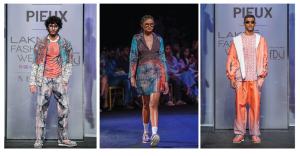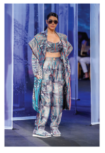 Modularity in design has been of great interest to the young designer, assembling and disassembling garments and being able to wear them in various ways. LED lights are added, he used his experience as a science student to include various aspects on how things can work when we look at them from different angles. Thus, the FDCIxLFW line plays with the concept of illusion—Life under the Microscope. If you notice the colours on the fridge magnet how they change, this year Pratyush has serenaded illusion — created in pleats, printed twice then ironed, presented in such a way that they create a new identity when you see them from left, centre or right. The line requires a great degree of research and development; we have also used recycled polyester to make bomber jackets to pants, layering to offer anti-fits, he explains.